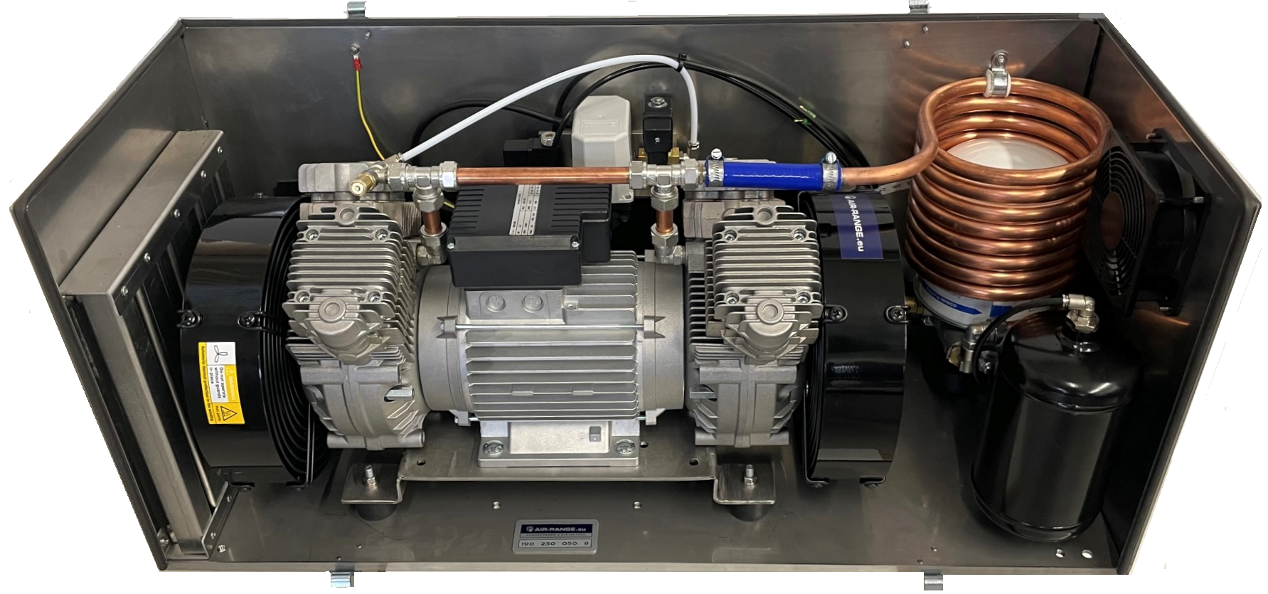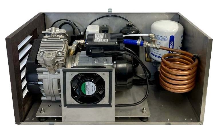Een krachtige 230Volt compressor die compleet met droger, relais en drukschakelaar en regeneratietankje is ingebouwd in RVS kist.