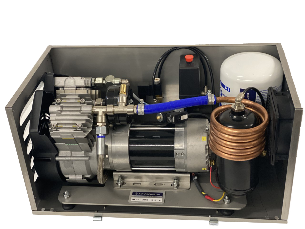 Een krachtige 80 Volt compressor met koolborstelvrij die zeer compact is ingebouwd in RVS kist. Deze compressor is instelbaar tussen 80V en 120V